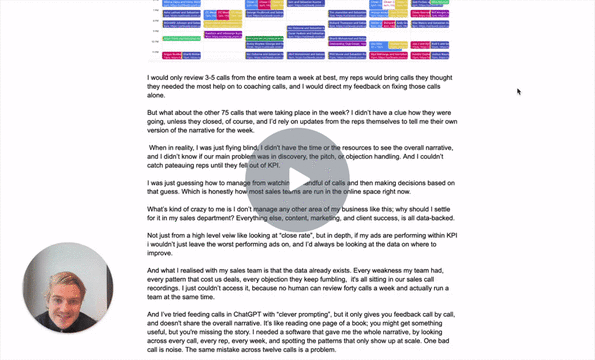 Your rep might hit their KPIs, but still be missing deals. You know you should be watching more of their calls—but you don't have time to coach everyone 1:1, even if it would lift results by 10%.